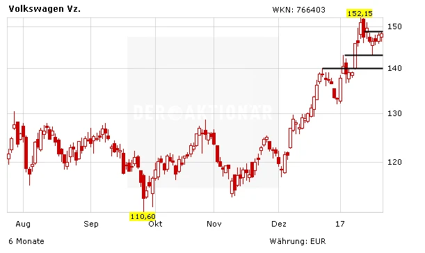 DER AKTIONÄR hält an seiner Einschätzung fest: VW ist und bleibt die spekulativste Wahl unter den europäischen Autobauern. Anleger lassen sich vorerst dadurch nicht aus der Ruhe bringen. Unterstützungen für die Aktie liegen bei 143 Euro und 140,50 Euro. Fällt die Marke von 148,14 Euro nach oben, das Tief aus dem Monat Oktober 2014, lautet das nächste Etappenziel 158,38 Euro. Das Tief aus dem Monat September 2015. Damit wäre dann auch gleichzeitig das Gap geschlossen.