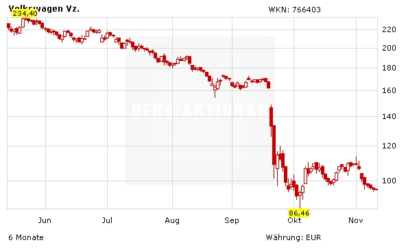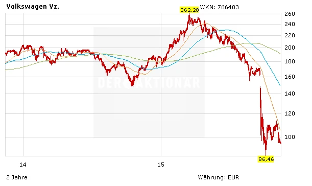 Der Verkaufsdruck hat in den letzten Tagen etwas nachgelassen. Gut möglich, dass die VW-Aktie auf Sicht von 12 bis 24 Monaten ein ordentliches Chance-Risiko-Verhältnis aufweist, dennoch steckt in der Aktie eine ordentliche Portion Unsicherheit über den weiteren Verlauf des Abgasskandals.