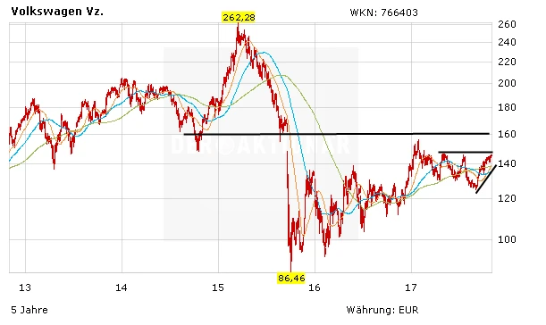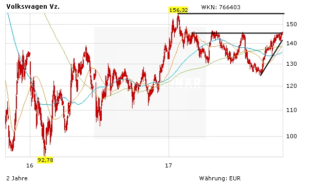 Die Investoren begrüßen die Bekenntnis des VW-Konzerns zur Elektromobilität, zu neuen Ideen ,neuen Konzepten. Dafür nehmen die Anleger auch geringere Gewinne in den nächsten Jahren in Kauf. Die Aktie sieht nach wie vor spannend aus. Wird die Marke von 146 Euro durchbrochen, sind 156 Euro möglich.