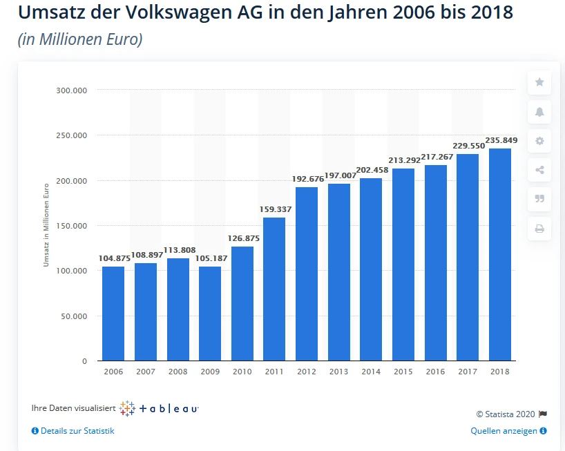 2018 hatte der Umsatz des Volkswagen-Konzerns auf 235,8 Milliarden Euro zugelegt. Der Gewinn war unterm Strich auf 12,15 Milliarden Euro geklettert. Ohne Sondereinflüsse - 3,18 Milliarden Euro - wie beispielsweise die Rechtskosten für "Dieselgate" und weitere Faktoren lag das Betriebsergebnis der Gruppe bei 17,1 Milliarden Euro. Weltweit hatte der Konzern mehr als 664 000 Mitarbeiter.