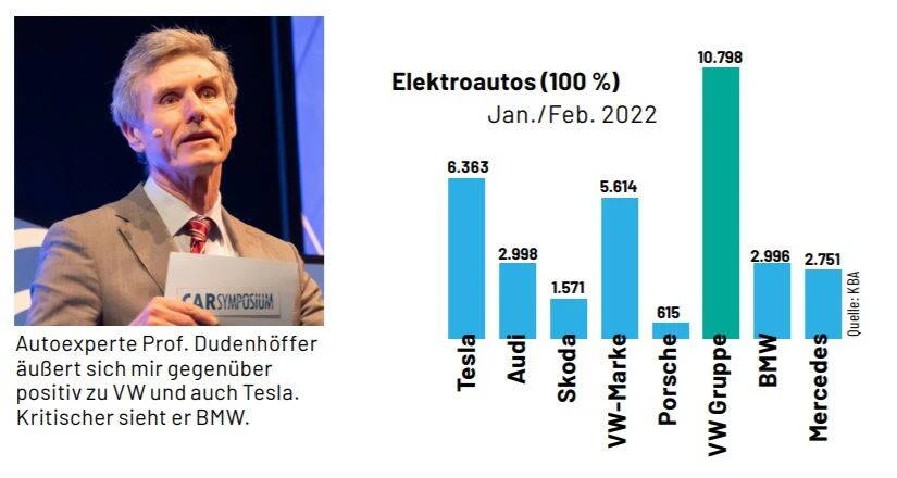 Wie viel mehr E-Autos verkauft Tesla als Volkwagen, wurde nun der VW-Boss im Interview mit 60 Minutes gefragt. Wie weit ist der Vorsprung? „Ehrlich gesagt, ziemlich weit“, weltweit gesehen, so Diess. Die VW-Gruppe hatte 2021 rund 450.000 reine E-Autos verkauft, Tesla das Doppelte. Immerhin: Wie jüngst im HSR (siehe Grafik) gezeigt: Im Heimatmarkt liegt VW bereits deutlich vor dem US-Rivalen.
