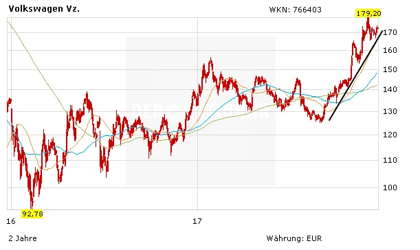 Die Aktie konsolidiert derzeit auf hohem Niveau. Wichtig ist der Widerstand bei 175 Euro. Wird dieser genommen sind in einem freundlichen Gesamtmarkt Kurse von 220 Euro plus X möglich. Die VW-Aktie ist und bleibt der Favorit in der Autobranche.