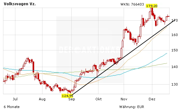 Im Monat November hat die Kernmarke VW-Pkw bei den Auslieferungen um knackige 11,8 Prozent auf 594.300 Autos zugelegt. Da ist es auch nicht verwunderlich, dass die Analysten der HSBC Potenzial bis 206 Euro sieht. Exane BNP hält 200 Euro für machbar.