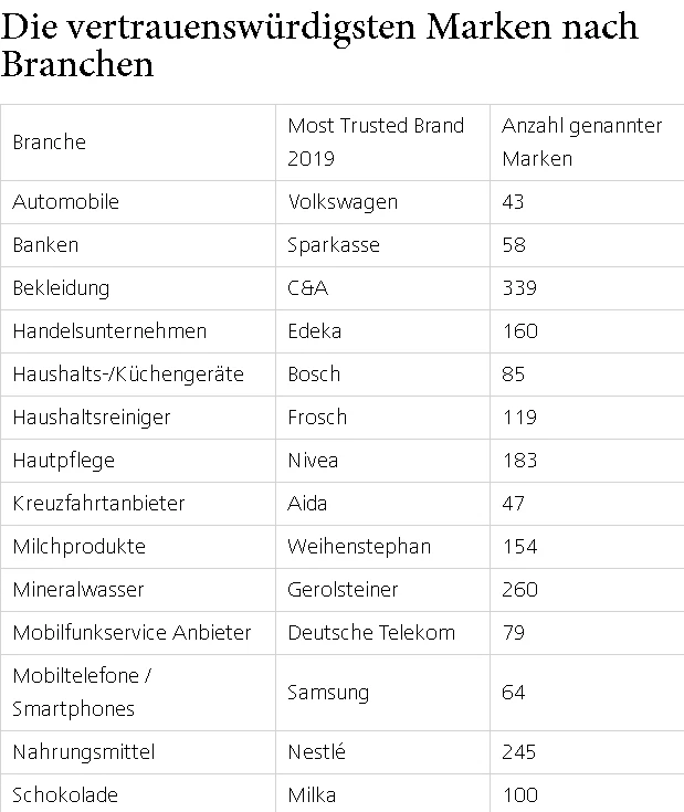 Ohnehin gab es in der Studie von Digest Brands nur wenige Veränderungen im Vergleich zum Vorjahr. In nur zwei von insgesamt 27 Produktkategorien gab es einen Wechsel an der Spitze. Bosch eroberte den Platz an der Sonne von Miele zurück und Nestlé kickte Dr. Oetker im Bereich der Nahrungsmittel vom Thron.