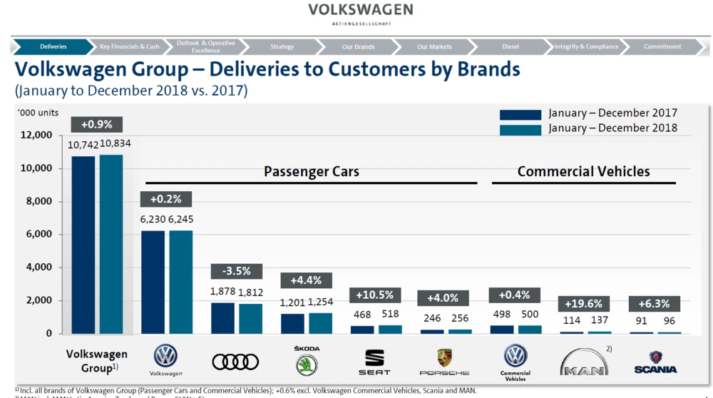 2018 lieferte der Konzern mit 10,83 Millionen Fahrzeugen mehr Autos aus als jemals zuvor. Im Dezember gab es allerdings einen empfindlichen Rückgang um 8,4 Prozent auf 916.200 Autos. Dennoch verzeichneten die Marken VW Pkw, Skoda, Seat, Porsche und Lamborghini Rekorde.