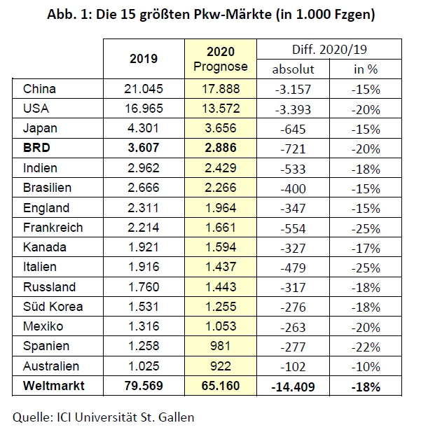 Ferdinand Dudenhöffer von der Universität St. Gallen erwartet einen ähnlich starken Einbruch für die Automobil-Hersteller. „In Summe muß man für das Jahr 2020 mit einem Einbruch von 14,4 Millionen Neuwagen rechnen“ sagt der Auto-Experte.
