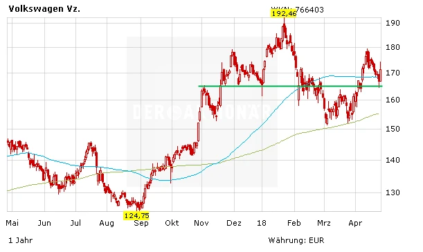 Die VW-Vorzugsaktie schoss nach den Zahlen an der Börse zeitweise um gut drei Prozent auf 172,60 Euro nach oben. Damit scheint das DAX-Schwergewicht den Aufwärtstrend seit Ende März wieder fortzusetzen.