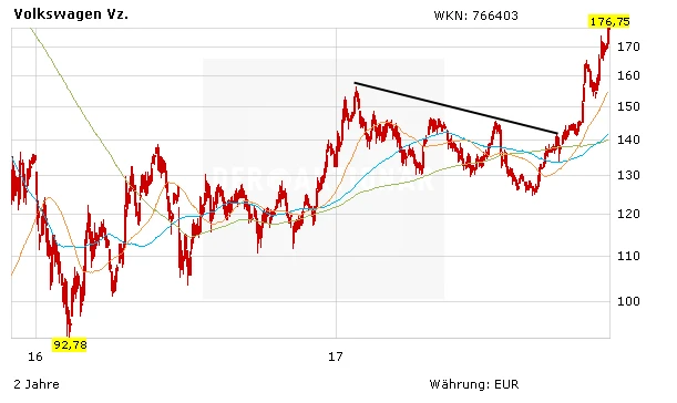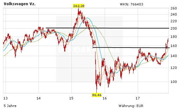 Sehr positiv gestimmt sind auch die Experten von Barclays. Die Rallye von Volkswagen seit den Zahlen für das dritte Quartal sei noch nicht vorbei. Dies sei "nur der Anfang" einer Verbesserung, erklärten die Experten und verweisen auf die Produkte und den geografischen Mix sowie Cash-Generierung. Das Kursziel für die VW-Aktie lautet 195 Euro. Läuft alles gut, dann wäre sogar eine Notierung von 254 Euro möglich. Die Experten von Barclays verweisen auf die Verbesserung der Fundamentaldaten infolge der Stärkung der SUV-Modellpalette und des Engagements in sich erholenden Schwellenmärkten. VW werde wieder zu "einer Geldmaschine" werden.