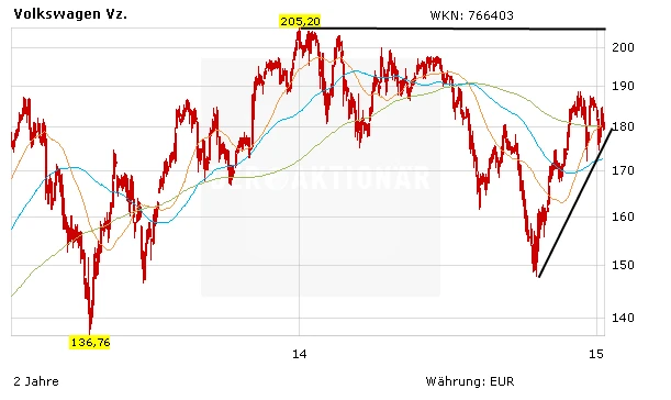 Fakt ist: Der Autoabsatz boomt. Die Weichen für eine hervorragende Zukunft des VW-Konzerns sind gestellt. Lange Zeit war im Autosektor die Daimler-Aktie der Favorit von DER AKTIONÄR. Jetzt sollten Anleger einen Fuß bei Volkswagen in die Tür stellen. Wichtig wäre ein Ausbruch über das alte Hoch bei 205 Euro. Das würde ein neues Kaufsignal bedeuten. Die VW-Aktie könnte in den nächsten Monaten eine ähnliche Aufholjagd wie Daimler in der Vergangenheit starten.