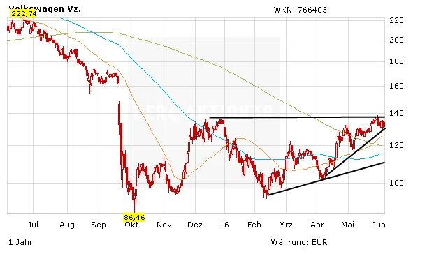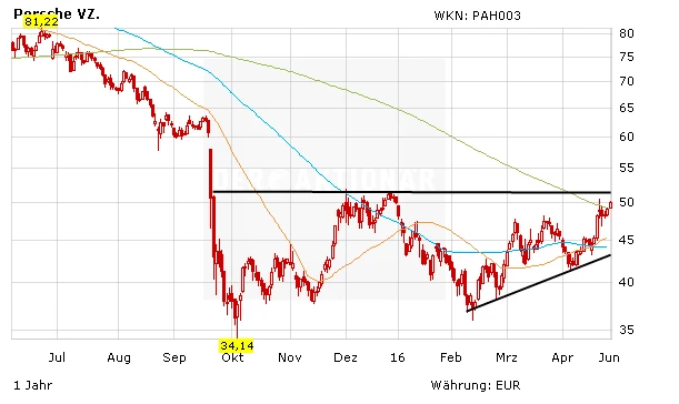 Die Porsche-Aktie geht im Windschatten von Volkswagen peu a peu weiter nach oben. Vor wenigen Tagen wurde die wichtige 200-Tage-Linie von unten nach oben durchbrochen, was ein neues Kaufsignal auslöste. Aus Trading-Gesichtspunkten ist das Papier nach wie vor ein Kauf!