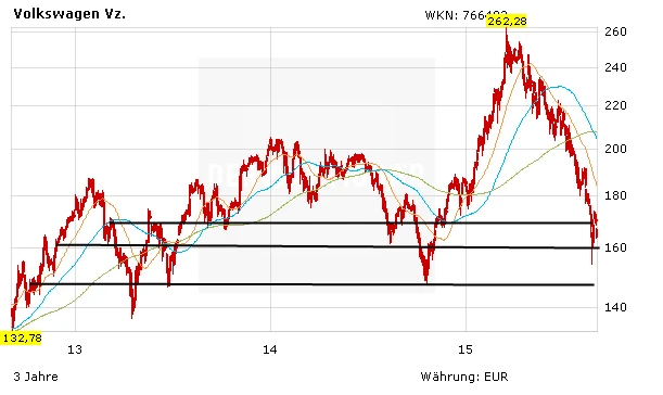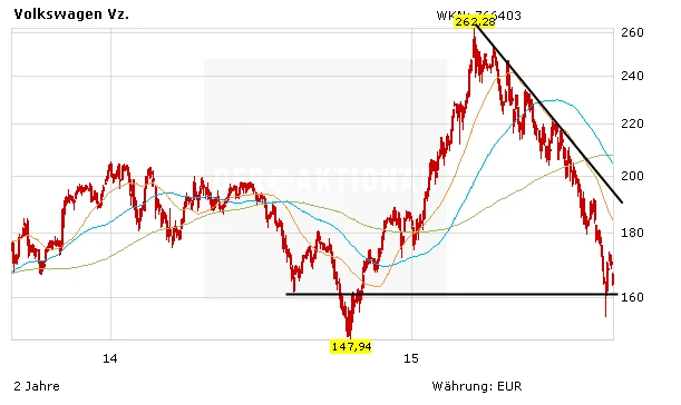 Dennoch: Es nützt derzeit alles nichts. Anleger warten eine Bodenbildung der VW-Aktie ab. Diese sollte im Bereich von 160 Euro und 170 Euro erfolgen. Die sehr starke Abhängigkeit von China macht es VW derzeit sehr schwer. Winterkorn und seine Mannschaft haben in den nächsten Monaten alle Hände voll zu tun. Abwarten!