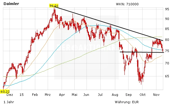 Die VW-Aktie ist zuletzt wieder unter die Marke von 100 Euro gefallen. Zwischen 90 und 98 Euro scheint sich aber eine Bodenbildung abzuzeichnen. Was bleibt ist die Unsicherheit rund um die Höhe des Schadens des ganzen Abgas-Skandals. Und die Börse hasst nichts mehr als Unsicherheit. Der große Abgabedruck jedenfalls hat in den letzten Tagen nachgelassen. Große Sprünge sind von der Aktie auf die schnelle allerdings nicht zu erwarten. DER AKTIONÄR favorisiert im Autosektor nach wie vor Daimler und Peugeot.