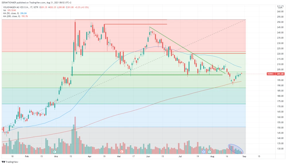 Nachdem die Volkswagen-Aktie Mitte August eine abfallende Dreiecksformation an der 200-Euro-Marke nach unten aufgelöst hatte, setzte sie innerhalb von wenigen Tagen bis an die wichtige Unterstützung an der 200-Tage-Linie bei 192,09 Euro zurück (DER AKTIONÄR berichtete). Zwar rutschte der Kurs sogar kurzzeitig unter diesen Support, jedoch konnte er diesen noch am selben Tag zurückerobern und zu einem Rebound ansetzen.