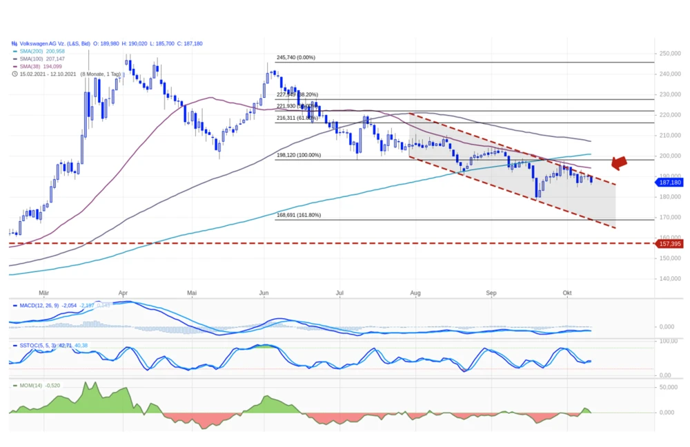 Es bleibt vorerst dabei: Die VW-Aktie hat den Angriff auf die Widerstandslinie bei 198 Euro vertagt. Erst sobald diese Marke geknackt wird, signalisiert das Papier ein neues Kaufsignal. Aktuell notiert die VW-Aktie bei 188 Euro. Der nächste Support liegt bei 186 Euro. Fällt auch diese Marke, liegt die nächste Unterstützung bei 177 Euro
