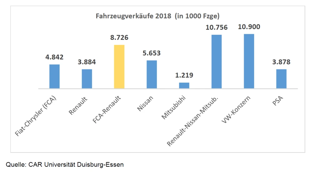 Insgesamt hat die Allianz Fiat-Chrysler Renault im letzten Jahr 10,756 Millionen Fahrzeuge verkauft, nur knapp hinter dem VW-Konzern mit 10,9 Millionen Autos. Einschließlich der Finanzdienstleistungssparte hat Renault letztes Jahr pro verkauftem Auto 930 Euro Gewinn vor Steuern erzielt. Bei Fiat-Chrysler waren es 848 Euro. Der VW-Konzern verdiente im Schnitt pro Auto 1.277 Euro. Bei PSA enthalten die Zahlen auch die Zulieferabteilung Faurecia.