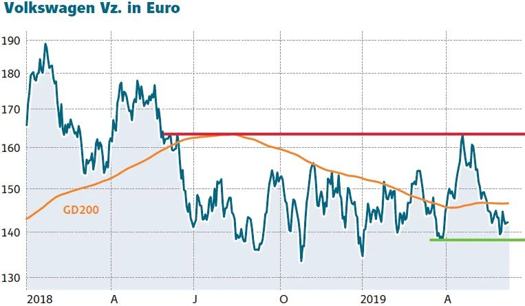Die Aktie von VW ist zuletzt aufgrund des Handelskriegs zwischen den USA und China sowie den schwachen Daten in China unter Druck geraten. Die wichtige 200-Tage-Linie wurde dabei unterschritten. Die nächste starke Unterstützungszone zwischen 138,10 und 139,50 Euro hat aber gehalten. Im Zuge der Korrektur wurde das Abstauberlimit des AKTIONÄR bei 138,50 Euro erreicht. Seitdem konnte sich das Papier bereits wieder etwas erholen. Charttechnisch wichtig ist allerdings die schnelle Rückeroberung der 200-Tage-Linie.