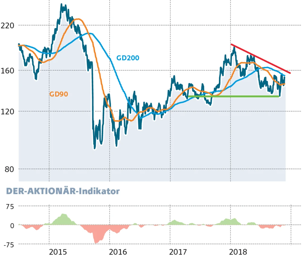 Auf dem Weg nach oben müsste die VW-Aktie die wichtige 200-Tage-Linie bei 154,28 Euro nachhaltig überwinden. Im Anschluss hätte das Papier Luft bis 175 Euro.