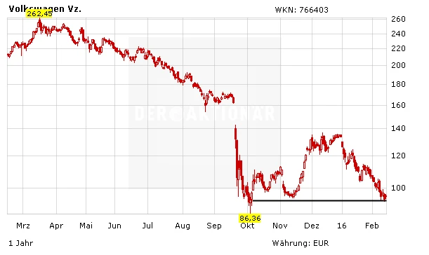 Dieser Pressebericht zeigt einmal mehr, dass die Aufarbeitung des Abgasskandals noch einen beträchtlichen Zeitraum in Anspruch nehmen wird. Deswegen sollten bei den VW-Vorzügen auch nur Anleger mit einem sehr langen Atem zugreifen. Positiv allerdings, dass die Aktie in der vergangenen Handelswoche im Gegensatz zum DAX kein neues 52-Wochen-Tief markiert, sondern die Unterstützung bei 92 Euro gehalten hat.