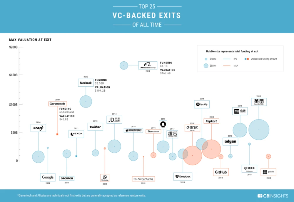 Die Geschichte von Son und Alibaba ist extrem, keine Frage. Die Zahl der lukrativen Exits für VCs ist dennoch nicht auf den einen beschränkt. In der folgenden Grafik sehen Sie 25 Deals, an denen sich die Profi-Investoren eine goldene Nase verdient haben.