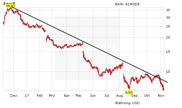 Am Dienstag ging es um weitere 13 Prozent abwärts. Der Grund: Fossil hat die Prognose für das vierte Quartal sowie für das Gesamtjahr gesenkt.