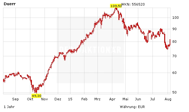 Im zweiten Quartal ist der Umsatz von Dürr um 77 Prozent auf 925 Millionen Euro und das EBIT um 45 Prozent auf 60,5 Millionen Euro gestiegen. Unter dem Strich steht ein Gewinn von 36,5 Millionen Euro zu Buche, 27 Prozent mehr als im Vorjahr. Der Hersteller von Lackieranlagen für die Autoindustrie profitiert vor allem vom schwachen Euro und dem damit verbundenen Nachfrageboom aus China und Nordamerika.