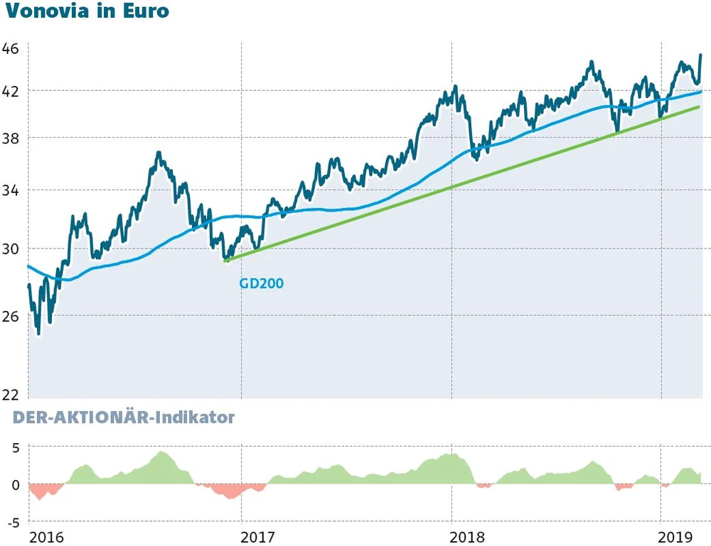 Die Aktie von Vonovia befindet sich in einem mustergültigen Aufwärtstrend. Sie hat die Zwischenhochs bei 42,70 und 44,88 Euro vom vergangenen Jahr überwunden und bei 45,22 Euro ein neues Allzeithoch ausgebildet. Das ist als neues Kaufsignal zu werten, charttechnisch ist der Weg somit nach oben offen.