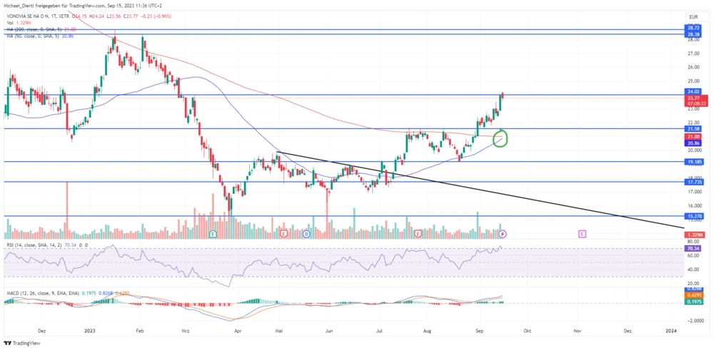 Am Freitagmorgen kletterte der Kurs sogar kurzfristig über die 24-Euro-Marke, konnte diese jedoch noch nicht nachhaltig überwinden. Das könnte sich allerdings durch das nächste Kaufsignal in Form eines sogenannten Golden Cross ändern. Dabei kreuzt der GD50 den GD200 von unten nach oben und lockt dadurch in der Regel weitere Käufer an. Dieses Kaufsignal könnte das bullishe Momentum weiter verstärken und die Aktie sogar in Richtung des Februar-Hochs bei 28,38 Euro treiben.