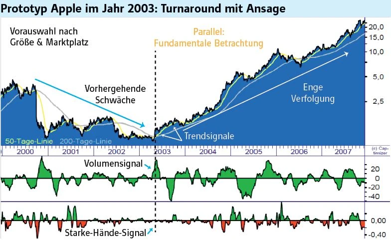 Viele bekannte Investoren sind gerade mit Aktien-Turnarounds reich geworden. Allen voran Warren Buffett kaufte Coca-Cola genau dann, als man in den 1980ern im Margen-Tal operierte. Ein weiteres Beispiel: Das Geschäft von Apple und der Aktienkurs lagen 2003 darnieder. Mit Steve Jobs kamen erste Lichtblicke zurück – auch der Chart drehte von einer Seitwärtsbewegung in einen neuen Aufwärtsmodus. Apple jetzt oben zu kaufen mag eine gute Idee sein. Doch richtig gewonnen haben Strategen, die früher eingestiegen sind: Bei Apple wurden aus 2.000 Dollar in 14 Jahren auf diese Weise 170.000 Dollar.