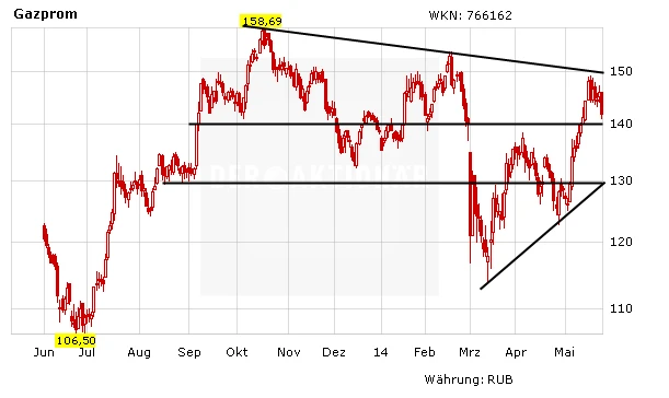 Durch den Rücksetzer am Dienstag hat sich das charttechnische Bild bei Gazprom deutlich eingetrübt. Entscheidend für den weiteren Verlauf ist, dass die Unterstützung bei 140 Rubel halten wird. Dort verläuft neben einer horizontalen Auffanglinie auch die 200-Tage-Linie. Sollte diese Marke nachhaltig unterschritten werden, müssen sich Anleger auf einen Rücksetzer auf 130 Rubel einstellen. Dort verläuft unter anderem der seit März gültige Aufwärtstrend.