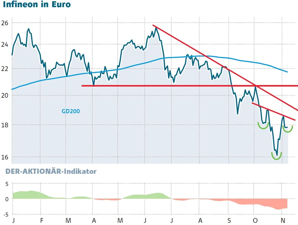 Infineon-Aktionäre brauchten zuletzt starke Nerven, nachdem der Wert im Branchensog deutlich korrigiert hat. Die zuletzt guten News aus der Branche (z.B. ASML) sprechen für einen Kauf. Aus charttechnischer Sicht arbeitet die Aktie weiterhin an einer inversen SKS-Umkehrformation, welche den jüngsten Abwärtstrend beenden könnte. Diese wird bei Ausbruch über die Nackenlinie bei 18,50 Euro aktiviert. Aktuell bildet sich die rechte Schulter aus. Das Minimalziel aus dem Umkehrmuster liegt bei 20,50 Euro. Spekulativ orientierte Anleger können vor den Zahlen mit einem Drittel der geplanten Position einsteigen.