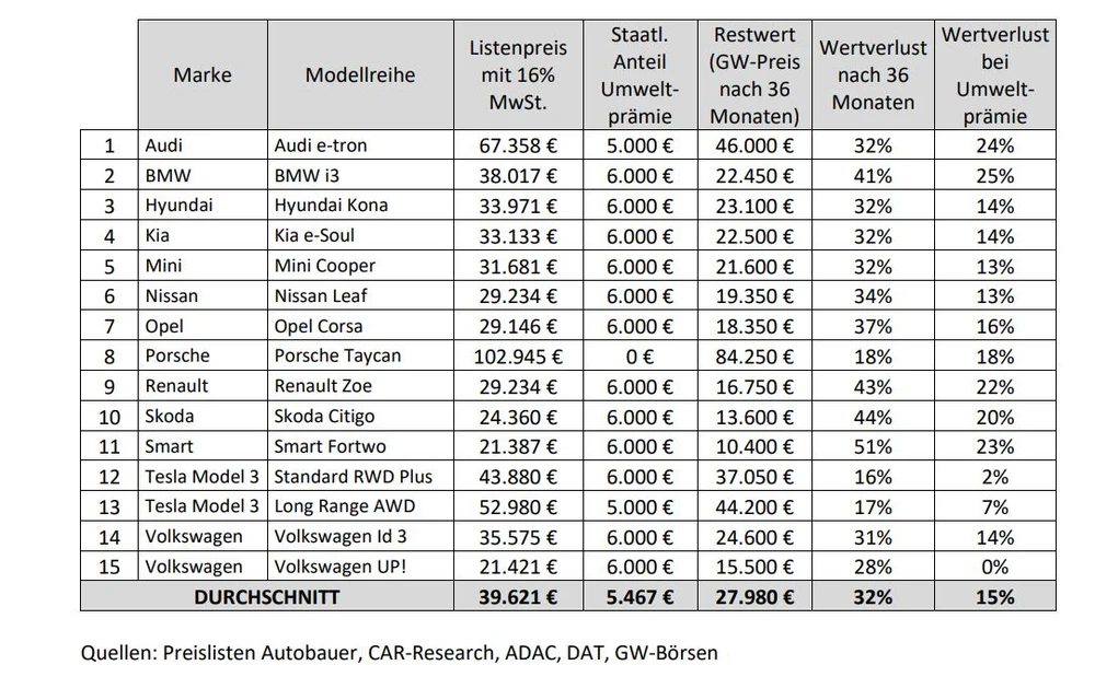 Das Tesla Model 3 in der „Standard RWD Plus“ Version habe im Jahr 2000 43.880 Euro gekostet. Heute würde das Fahrzeug auf dem Gebrauchtwagenmarkt zu 37.050 Euro gehandelt. Damit wäre ohne Berücksichtigung der Umweltprämie der Wertverlust „nur“ 16 Prozent. Subtrahiert man vom damaligen Listenpreis noch den staatlichen Anteil der Umweltprämie ergäbe sich ein Wertverlust von zwei Prozent.