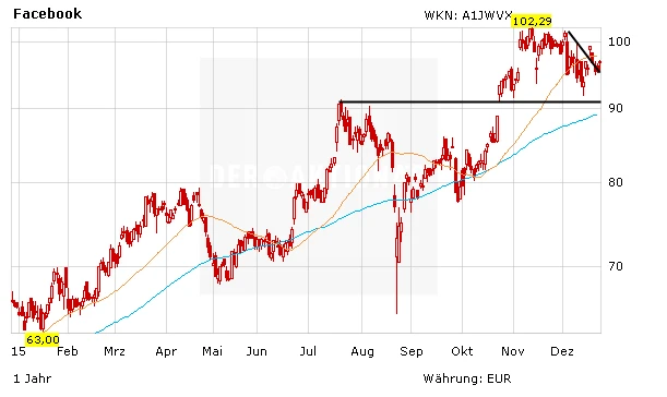 In den letzten Tagen durchbrach die Facebook-Aktie bereits den kurzfristigen Abwärtstrend. In nächster Zeit dürfte das Papier Kurs auf das Allzeithoch bei 102,29 Euro nehmen. Investierte Anleger bleiben dabei. Das Kursziel des AKTIONÄR lautet 120 Euro.