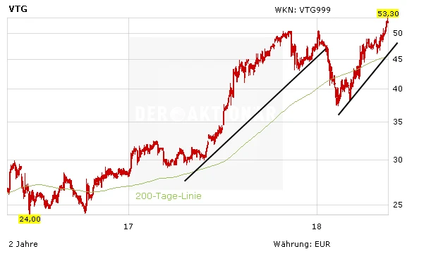 Die Papiere von VTG gerieten während der turbulenten Zeiten an den Weltbörsen in den vergangen Wochen und Monaten etwas unter die Räder. Der Aufwärtstrend wurde aufgrund dessen gestoppt und die Aktie konsolidierte deutlich. Seit Anfang März verbesserte sich jedoch das Chartbild. Infolge eines neuen Aufwärtstrends erreicht die Aktie mithilfe der Q1-Zahlen ein neues Allzeithoch bei 53,30 Euro. Gefolgt von einer weiter anhaltenden positiven Konjunkturentwicklung, sowie der erfolgreichen Abschließung der Nacco-Group-Übernahme könnten sich die Papiere der VTG weiter in Richtung 60 Euro bewegen. Für investierte Anleger gilt: Dabeibleiben!
