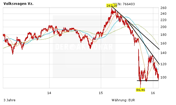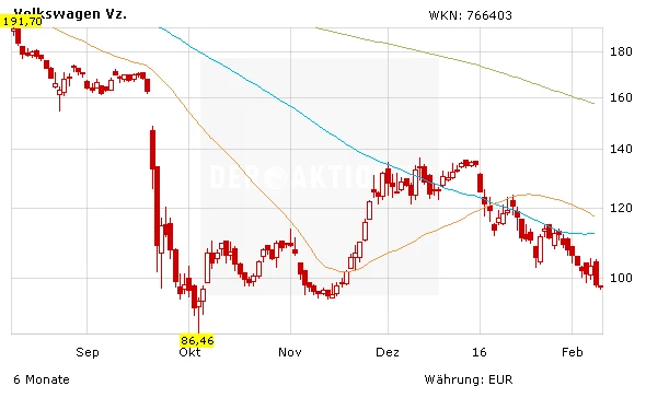 Die VW-Aktie geriet in einem schwachen Gesamtmarkt wieder unter Druck. Derzeit pendelt sich Aktie um die Marke von 100 Euro. Gut möglich, dass das Papier noch einmal darunter abrutscht. Es bleibt dabei: Auf diesem Niveau haben Anleger auf Sicht von 12 bis 24 Monaten ein gutes Chance-Risiko-Verhältnis. Die negativen Nachrichten sollten bei VW weitgehend eingepreist sein.