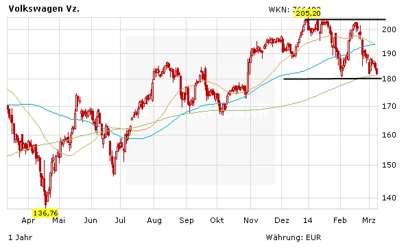 Die Aktie des Volkswagen-Konzerns kommt auch im laufenden Jahr nicht richtig vom Fleck. Nach wie vor hängt das Papier in der Seitwärtsrange fest. Am Montag veröffentlichte Christian Ludwig vom Bankhaus Lampe eine neue Studie. Das Kursziel für die VW-Aktie reduzierte er von 205 auf 183 Euro. Dafür gibt es laut Ludwig mehrere Gründe. „"Eine erfolgreiche Scania-Übernahme sollte rund sechs Euro pro Aktie „kosten“, allerdings ohne negativen EPS-Effekt bleiben. Wir passen unsere Schätzungen aufgrund der sehr vorsichtigen Guidance sowie der sich verschlechternden Entwicklungen in Russland an und stufen die Aktie mit einem neuen Kursziel von 183 Euro auf Verkaufen herab", so Ludwig.