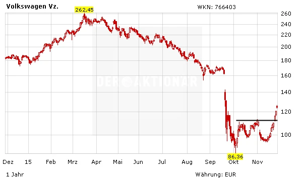 Die Aktie von Volkswagen hat in den vergangenen Tagen deutliche Zugewinne verzeichnen können. Allein am Donnerstag legte das Papier mehr als 3,5 Prozent auf 124,60 Euro zu. Damit ist die VW-Aktie auch über den seit Mitte September ausgebildeten Seitwärtstrend nach oben ausgebrochen. Nach wie ist der Abgasskandal das bestimmende Thema.