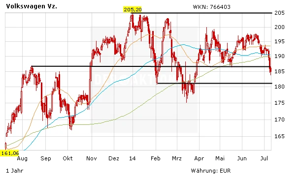 Vielleicht können die positiven News aus China der VW-Aktie wieder neues Leben einhauchen. Aufgrund der schwachen Marktverfassung am Donnerstag rutschte das Papier bis auf 182 Euro ab, konnte sich aber im Tagesverlauf wieder erholen. Zwischen 178 und 182 Euro liegt ohnehin eine größere Unterstützungszone. Sofern der Markt noch einmal stärker abrutscht, können Anleger einen Fuß in die Tür stellen und ein Abstauberlimit bei 175 Euro in den Markt legen.