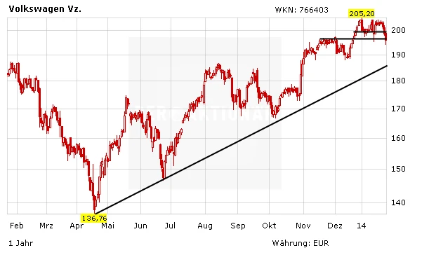 Der Chart der VW-Aktie zeigt sich derzeit noch nicht von seiner besten Seite. Nach der 200-Euro-Marke ist auch die Unterstützung bei rund 197 Euro gefallen. Nun deutet sich ein Test des langfristigen Aufwärtstrends bei 190 Euro an. Hier sollte die Wende gelingen, denn die langfristigen Aussichten sind nach wie vor gut.