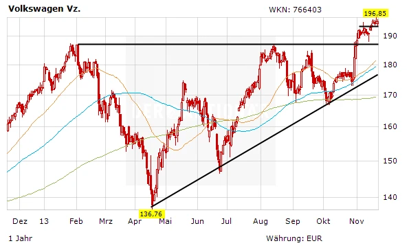 Zuletzt hat Analyst Frank Schwope von der NordLB das Kursziel für die VW-Aktie von 200 auf 215 Euro angehoben. Volkswagen könne im nächsten Jahr bei den Auslieferungszahlen die Zehn-Millionen-Grenze knacken und zweitgrößter Autobauer der Welt werden.