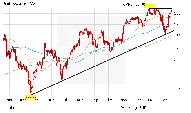 Die VW-Aktie setzt ihre Rallye fort. Vom Tief bei rund 183 Euro Anfang Februar ging es bis auf 202.50 Euro nach oben. Ein Plus von 11 Prozent. Am Dientag berichtet das Handelsblatt, wonach bei wichtigen Modellen der Konzerntochter Audi Nachbesserungen anstehen und einige sogar verspätet auf den Markt kommen sollen. Demzufolge soll insbesondere die wichtige Einführung des A4 erst Anfang 2015 erfolgen, ein halbes Jahr später als ursprünglich geplant.