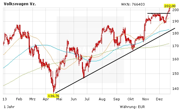 Die VW-Aktie klettert weiter. Kurz vor dem Jahreswechsel hat das Papier sogar den Sprung über die psychologisch wichtige Marke von 200 Euro geschafft.