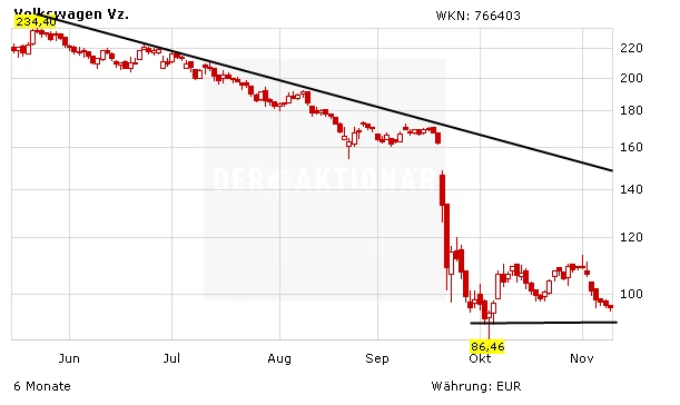 Die VW-Aktie ist zuletzt wieder unter die Marke von 100 Euro gefallen. Zwischen 90 und 98 Euro scheint sich aber eine Bodenbildung abzuzeichnen. Was bleibt ist die Unsicherheit rund um die Höhe des Schadens des ganzen Abgas-Skandals. Und die Börse hasst nichts mehr als Unsicherheit. Sicher hat in den letzten Tagen der große Abgabedruck nachgelassen. Große Sprünge sind von der Aktie auf die schnelle allerdings nicht zu erwarten. DER AKTIONÄR favorisiert im Autosektor nach wie vor Daimler und Peugeot.