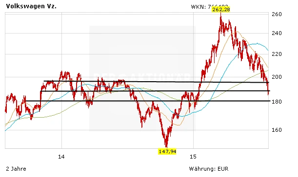 Es bleibt dabei: Massenhersteller VW hat derzeit besonders unter der Absatzschwäche in China zu leiden. Kein Wunder: 37 Prozent der Autos des VW-Konzerns werden in China verkauft, 60 Prozent der Gewinne stammen aus dem Reich der Mitte. Eine Bodenbildung der Aktie sollte im Bereich zwischen 185 und 195 Euro stattfinden. Hier liegen mehrere stärkere Unterstützungen. Nimmt der Verkaufsdruck noch einmal zu, kann ein Abstauberlimit bei 180 Euro platziert werden. Ein Kaufsignal entsteht erst wieder, wenn das Papier die obere Begrenzung des Abwärtstrendkanals bei rund 208 Euro nach oben überwindet.