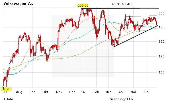 Die Aktie von Volkswagen hat sich in den letzten Tagen wieder von der psychologisch wichtige Marke von 200 Euro weg bewegt. Unterstützung gibt es jetzt von der 90- und der 200-Tage-Linie. Dennoch: VW ist gut gerüstet, um den lang ersehnten Sprung über das alte Hoch von 205,20 Euro zu schaffen. Dieser würde dann gleichzeitig die lange Seitwärtsbewegung beenden und neues Kurspotenzial freisetzen. Ein freundlicher Gesamtmarkt sind dann auch Kurse um 240 Euro durchaus machbar.