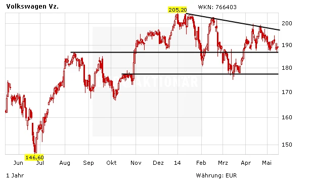 Nach der abgeschlossenen Scania-Übernahme und den geklärten Personalfragen ist der Volkswagen-Konzern weiterhin auf Kurs. Ebenfalls positiv: Aus charttechnischer Sicht hat sich die Marke bei rund 187 Euro als stabile Unterstützung erwiesen. Mit den erneut guten Nachrichten im Rücken könnte nach der Verschnaufpause zuletzt nun ein Angriff auf das Hoch bei 205 Euro eingeleitet werden.