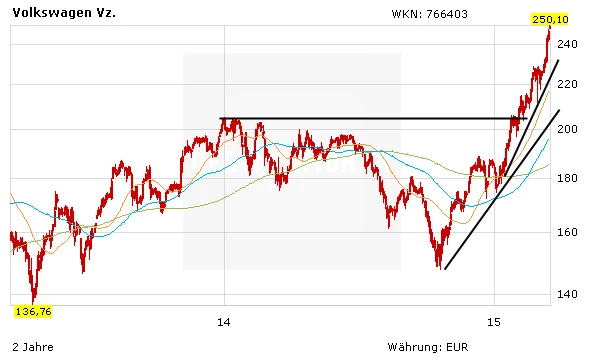 Die Aktie ist zuletzt super gelaufen. Am Montag knackte das Papier sogar die Marke von 250 Euro. Die VW-Aktie schreit förmlich nach einer Konsolidierung. Anleger sollten derzeit den steigenden Kursen nicht hinterherlaufen.