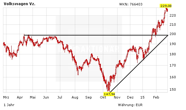 Die VW-Aktie entwickelt sich mehr und mehr zum Dauerläufer. Investierte Anleger bleiben bei der Rekordjagd dabei und setzen auf weitere Kursgewinne. Neben Daimler sind die VW-Titel nach wie vor einer der Favoriten im Autosektor. Im freundlichen Gesamtmarkt ist die Marke von 260 Euro in den nächsten Monaten möglich.
