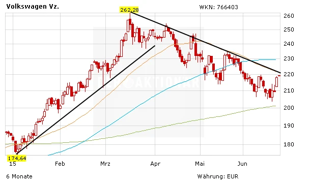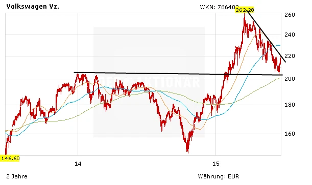 Nach der scharfen Korrektur bis auf knapp 205 Euro hat die VW-Aktie wieder angezogen. Dabei traf das Papier auf eine ausgeprägte Unterstützung sowie die ansteigende 200-Tage-Linie. Das aktuelle Kursniveau bietet noch immer eine attraktive Einstiegschance. DER AKTIONÄR ist davon überzeugt, dass VW seine Probleme in den USA in den Griff bekommen wird. Auch die Rentabilität der Kernmarke VW-PKW sollte in nächster Zeit deutlich steigen.