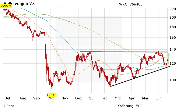 Es bleibt dabei: Der Abgas-Skandal dürfte zu einem großen Teil eingepreist sein. Lediglich das schwache Marktumfeld hat zuletzt die weitere Erholung der VW-Aktie gestoppt. Die Konsolidierung endete exakt auf der unteren Begrenzung des kurzfristigen Aufwärtstrends. Mutige Anleger können darauf setzen, dass die Aufholjagd weitergeht. DER AKTIONÄR sieht ein Kursziel von 150 Euro. Der Stoppkurs liegt bei 110 Euro.