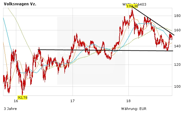 Die Autobauer müssen in den nächsnte Jahren Milliarden in neue Mobilitätstdienste, Elektromobilität sowie andere alternative Antriebsformen stecken. Hinzu kommt das Diesel-Dilemma. Gut möglich, dass die konjunkturellen und regulatorischen Risiken sowie die Nachfrageschwäche in wichtigen Absatzmärkten noch nicht vollständig im VW-Kurs eingepreist sind. Es besteht nach wie vor die Gefahr, dass die Konsensschätzungen für 2019 zu hoch sind. Dennoch zeigt sich die VW-Aktie in den letzten Wochen auf niedrigem Niveau stabil. Rücksetzer bis zur Widerstandslinie bei 137,50 Euro möglich. Abwarten.